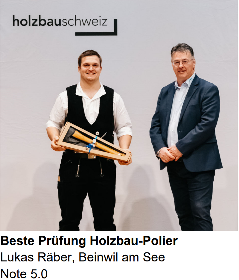 Besonders hervorheben und würdigen möchten wir die Leistung von Lars Niklas Glauser Holzbau-Vorarbeiter und Lukas Räber Holzbau-Polier. Wir gratulieren ganz herzlich.